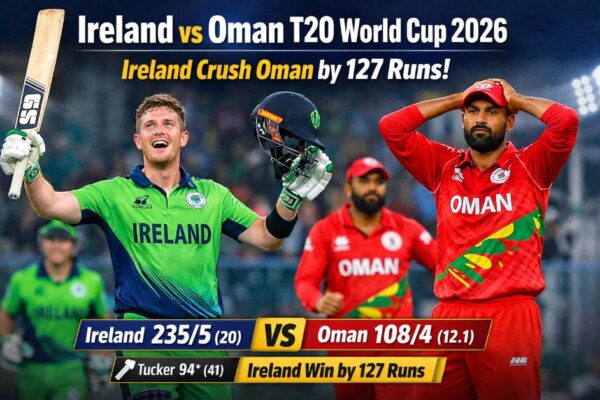Ireland vs Oman T20 World Cup 2026 में आयरलैंड ने ओमान को 127 रन से हराया। लॉरकन टकर की 94* रन की पारी और 235/5 का स्कोर बना। ICC Men’s T20 World Cup 2026 के 22वें मैच में आयरलैंड ने ओमान को 127 रन से हराकर टूर्नामेंट में अपनी पहली जीत दर्ज की। कोलंबो के…